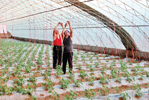 2月20日,忻府區(qū)“四季采摘園”大棚種植區(qū)的瓜農正在為甜瓜吊蔓。