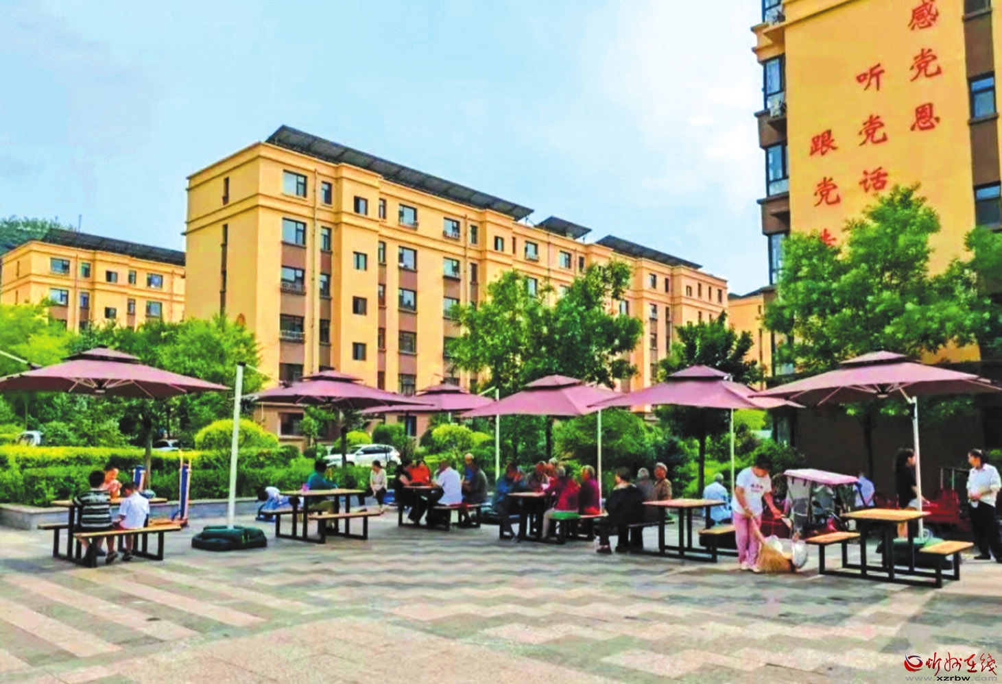 為把好事辦實,社區(qū)迅速聯(lián)合保德縣佳美物業(yè)管理有限公司啟動“共建共享”便民行動。通過線上線下征集大家意見,選定適配的環(huán)保設(shè)施,依人流分布規(guī)劃7套桌椅和遮陽棚位置。為不影響居民日常生活,施工特意選在周末時間,社區(qū)全程監(jiān)督質(zhì)量,物業(yè)專人驗收把關(guān),僅一天時間,廣場便煥然一新。米黃色的桌椅整齊列隊,紫色遮陽棚為居民撐起一片清涼天地。