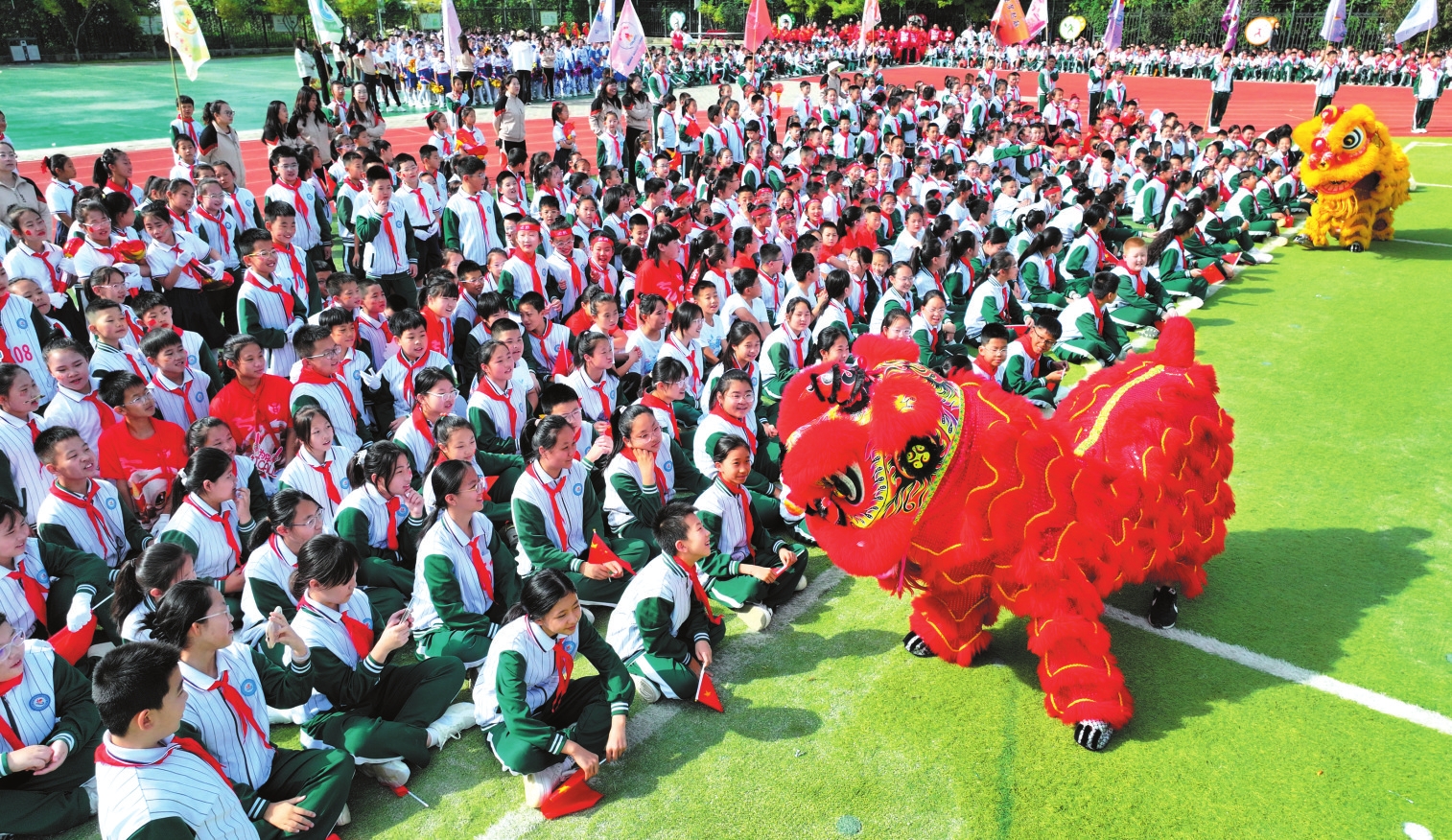 9月28日,忻州市長(zhǎng)征小學(xué)西校區(qū)舉行第二屆秋季田徑運(yùn)動(dòng)會(huì)。圖為開(kāi)幕式上孩子們與“獅”互動(dòng)。(記者 張存良攝)