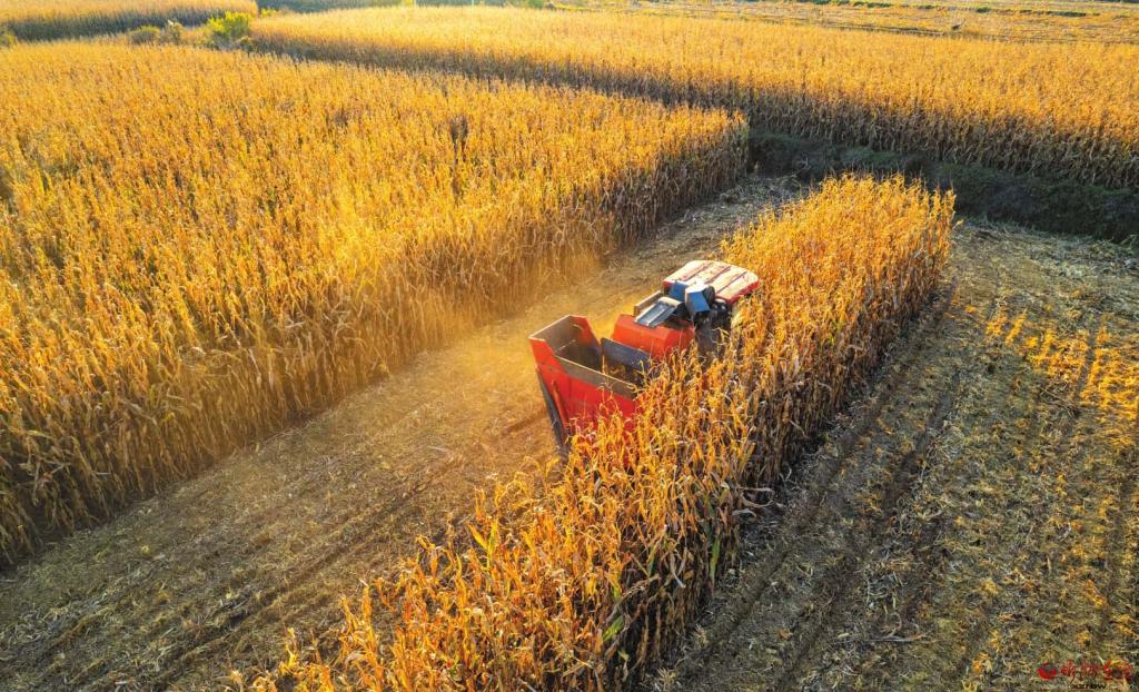 近日,原平市崞陽鎮(zhèn)下韓村村民正在緊張有序地?fù)屖沼衩祝_保秋糧顆粒歸倉。 (