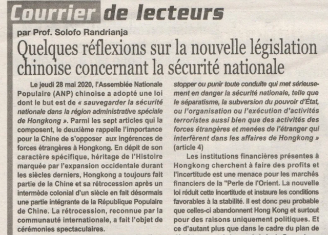 近日,馬達加斯加政治研究學(xué)院、塔馬塔夫大學(xué)教授蘇魯夫先生在馬達加斯加主流報紙上發(fā)表文章《關(guān)于對中國涉港國家安全立法的幾點思考》。