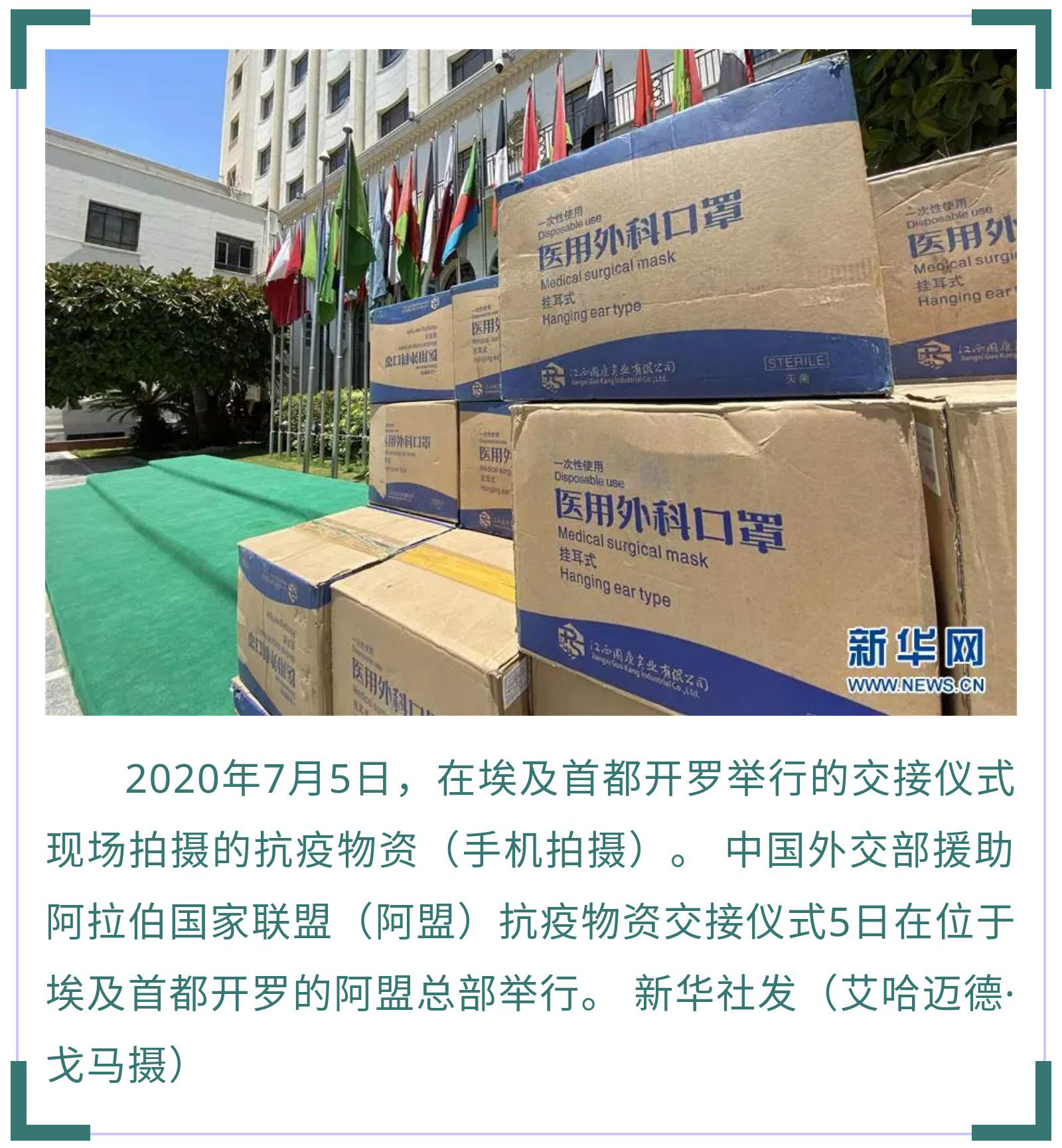 7月5日,中國外交部援助阿盟抗疫物資交接儀式在開羅舉行。中國駐埃及大使廖力強(qiáng)代表中國外交部向阿盟副秘書長胡薩姆·扎基移交了防護(hù)口罩。據(jù)廖力強(qiáng)介紹,新冠疫情暴發(fā)以來,中方向阿拉伯國家援助了大量物資,毫無保留地向阿拉伯國家分享抗疫經(jīng)驗(yàn)和技術(shù),同21個(gè)阿拉伯國家舉辦了衛(wèi)生專家視頻會議,向8個(gè)阿拉伯國家派遣了醫(yī)療組,同時(shí)協(xié)助阿拉伯國家在中國采購抗疫物資,支持阿拉伯國家有序復(fù)工復(fù)產(chǎn)。