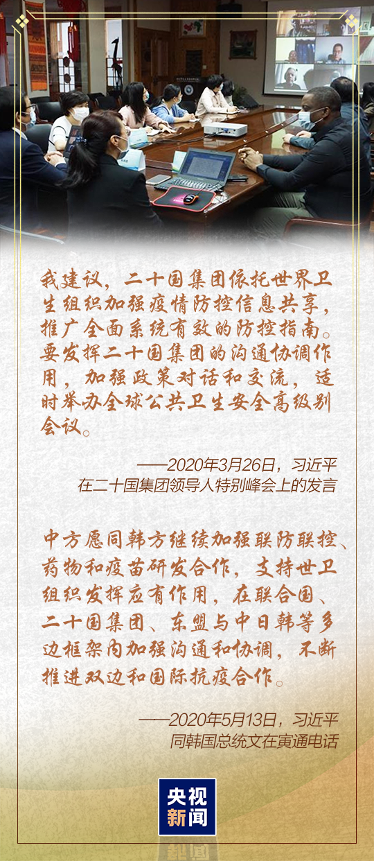 3月26日晚舉行的二十國集團領(lǐng)導人特別峰會上,習近平主席宣布“同各國分享防控有益做法,開展藥物和疫苗聯(lián)合研發(fā)”“探討建立區(qū)域公共衛(wèi)生應(yīng)急聯(lián)絡(luò)機制”“加大向國際市場供應(yīng)原料藥、生活必需品、防疫物資等產(chǎn)品”……
