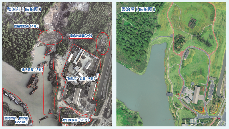 薛家洼生態(tài)園地處長江東岸,占地986畝,曾經(jīng)生態(tài)環(huán)境問題非常突出,原有非法碼頭3家,散亂污企業(yè)7家,固廢堆場1處,規(guī)?;笄蒺B(yǎng)殖場2個,危舊民居96戶,??繚O民作業(yè)船、住家船223條。“晴天一身灰,雨天一身泥”,這是曾經(jīng)薛家洼的真實寫照。