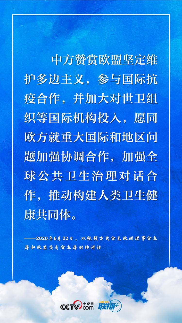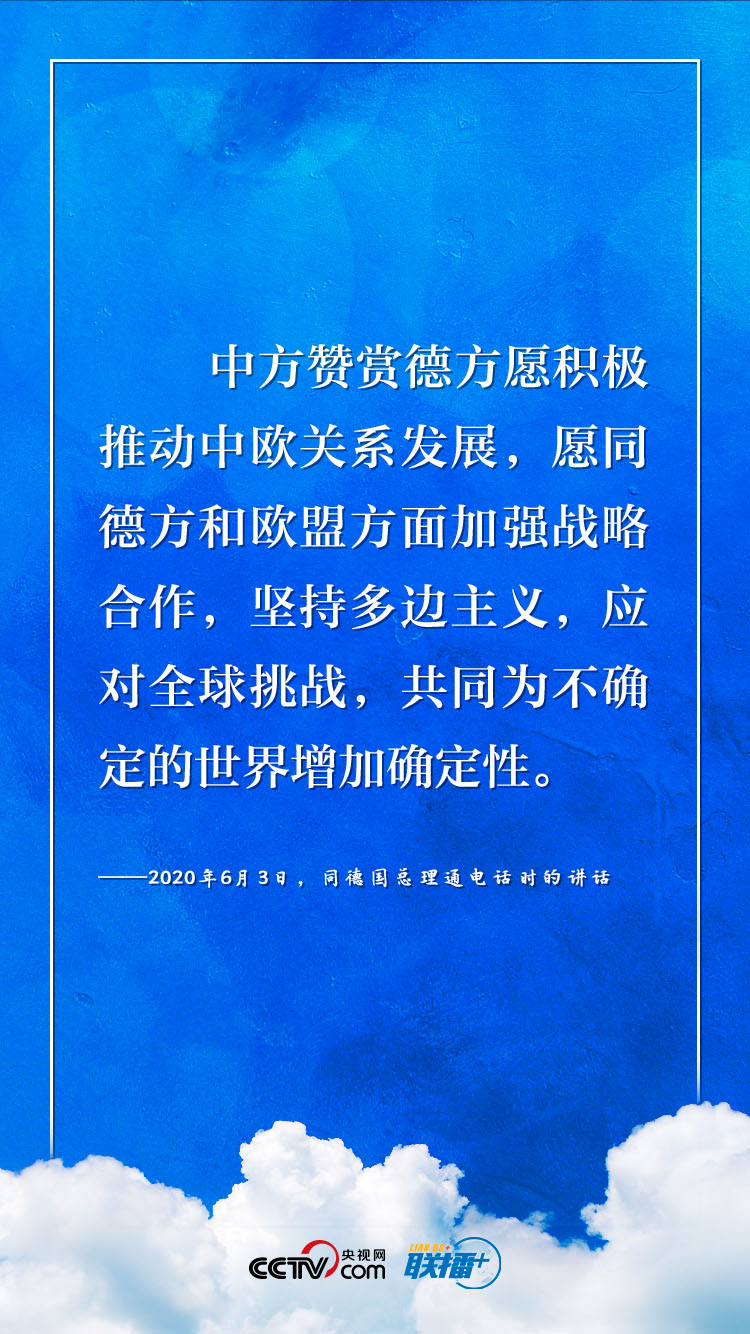 9月14日,習近平主席將以視頻方式同德國總理默克爾、歐洲理事會主席米歇爾、歐盟委員會主席馮德萊恩共同舉行中德歐領(lǐng)導(dǎo)人會晤。《聯(lián)播+》梳理今年以來習近平主席與德國、歐盟領(lǐng)導(dǎo)人“云外交”的部分講話,與您共同感受團結(jié)合作中蘊藏的深遠意義。