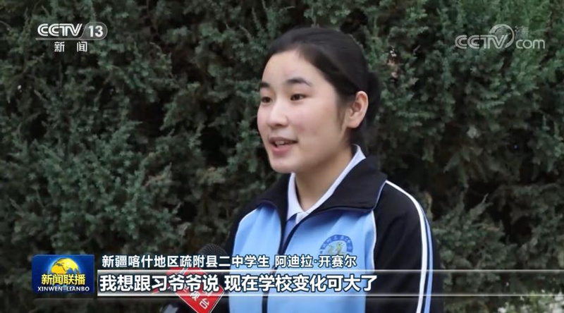 從設(shè)施到扶貧,從醫(yī)療到教育,發(fā)生在新疆的變化各族人民感同身受。疏附縣二中學(xué)生阿迪拉告訴記者,2014年4月,習(xí)近平總書(shū)記來(lái)學(xué)??赐麕熒?,還跟大家合了影。站在總書(shū)記右手邊的就是阿迪拉,現(xiàn)在她已經(jīng)是一名高中生了。