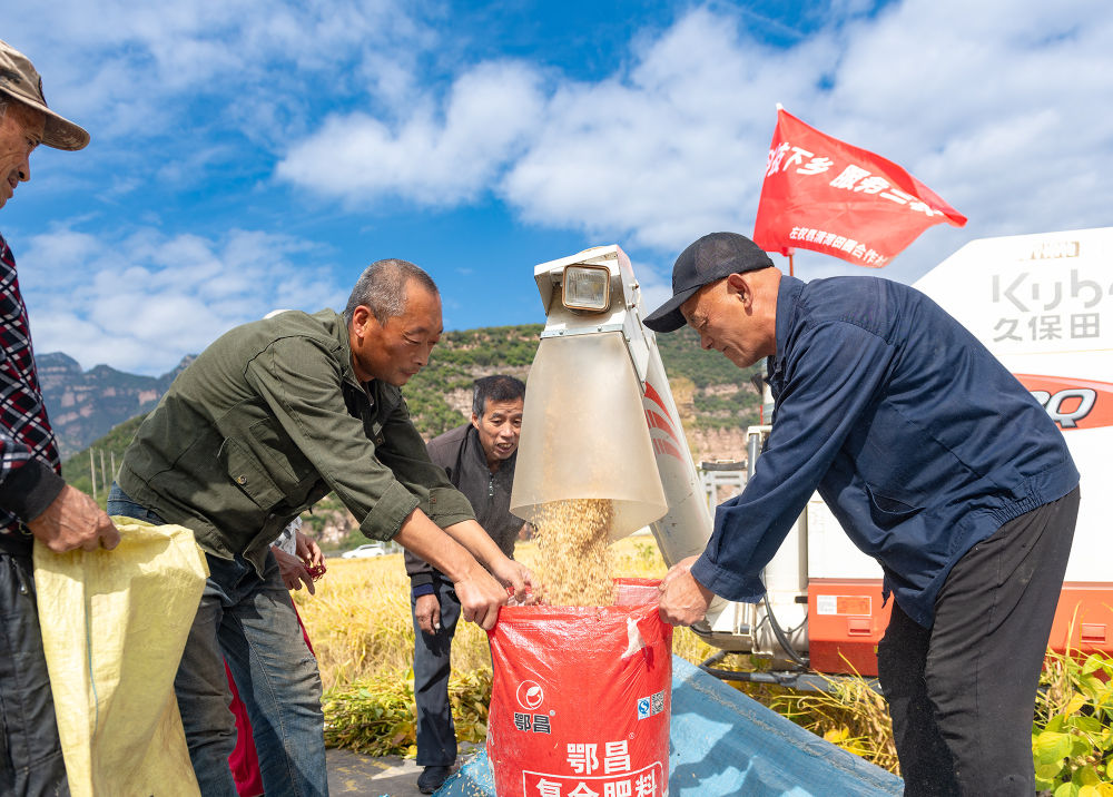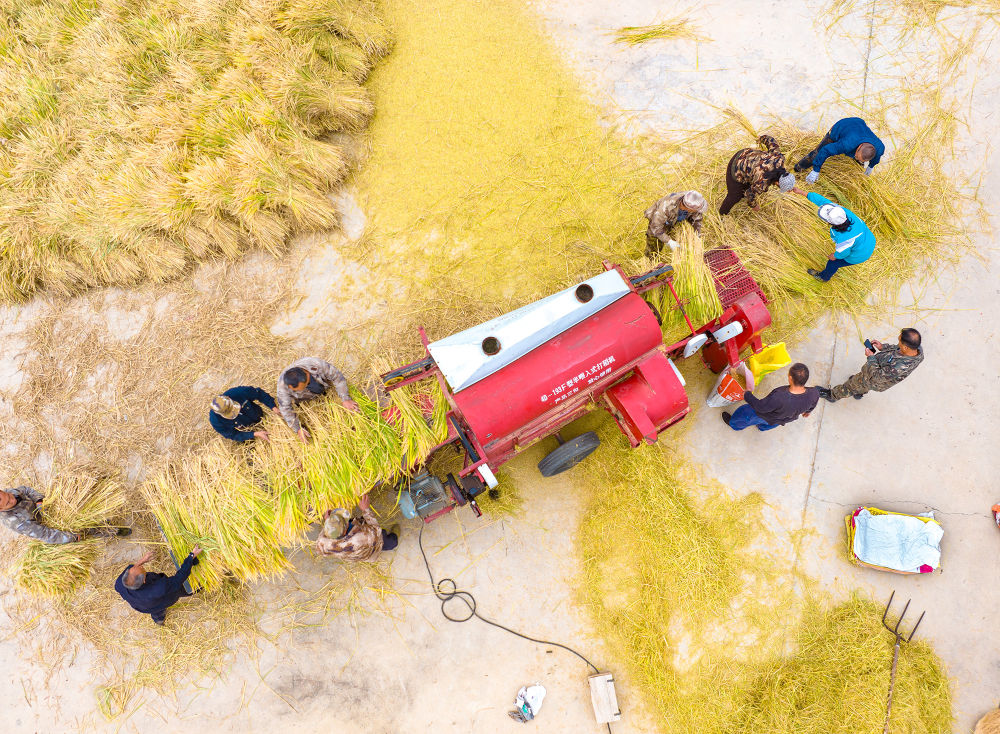 田間地頭,一派繁忙景象。大型收割機在成片的稻浪中轟鳴穿梭,高效完成收割、脫粒等工序;對于部分因大風倒伏的水稻,村民們則彎腰進行人工搶收。與此同時,打谷、裝袋、運輸……各項工序有條不紊,機械與人力緊密配合,勾勒出一幅生動的秋收畫卷。