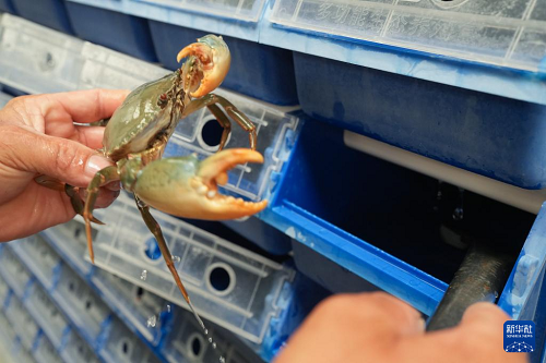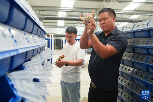 9月2日,在寧??h一市鎮(zhèn)的一家青蟹生產(chǎn)企業(yè),工作人員在暫儲(chǔ)青蟹的“蟹公寓”中查看其健康狀態(tài)。(新華社記者 翁忻旸 攝)