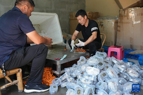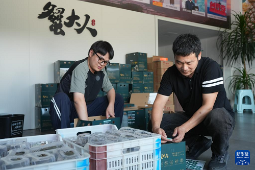 9月2日,在寧海的一家青蟹銷售網(wǎng)店,工作人員將青蟹裝箱快遞。(新華社記者 翁忻旸 攝)
