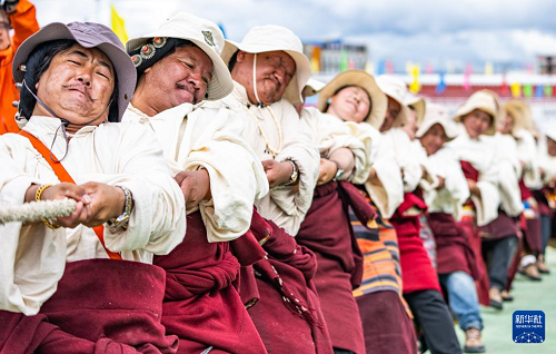 9月6日,在那曲市恰青賽馬節(jié)現(xiàn)場(chǎng),選手們參加拔河比賽。(新華社記者 丁增尼達(dá) 攝)