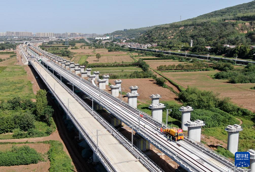 9月8日,施工車輛在西十高鐵西安東至藍(lán)田區(qū)間鋪設(shè)無縫鋼軌(無人機(jī)照片)。(新華社記者 李一博 攝)