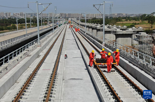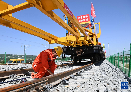 9月8日,施工人員在西十高鐵西安東至藍(lán)田區(qū)間鋪軌現(xiàn)場作業(yè)。(新華社記者 李一博 攝)