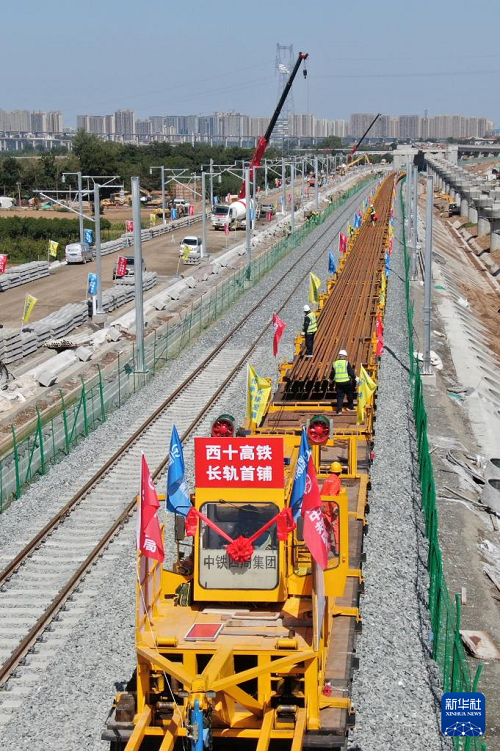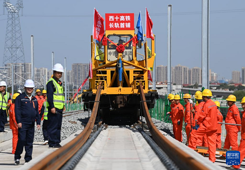 9月8日,施工人員在西十高鐵西安東至藍(lán)田區(qū)間鋪設(shè)無縫鋼軌。(新華社記者 李一博 攝)