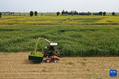 9月11日,農(nóng)機手操作農(nóng)機在杭錦旗吉日嘎朗圖鎮(zhèn)格更召嘎查田間收割青貯玉米(無人機照片)。(新華社記者 李志鵬 攝)