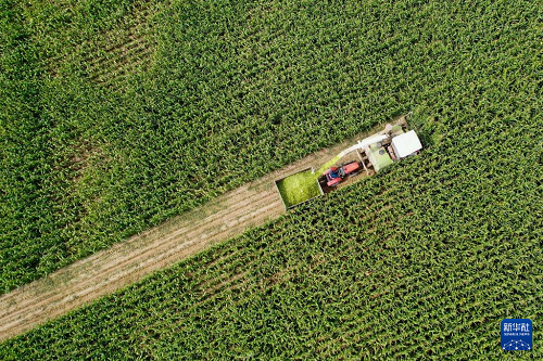 9月11日,農(nóng)機手操作農(nóng)機在杭錦旗吉日嘎朗圖鎮(zhèn)格更召嘎查田間收割青貯玉米。(新華社記者 李志鵬 攝)