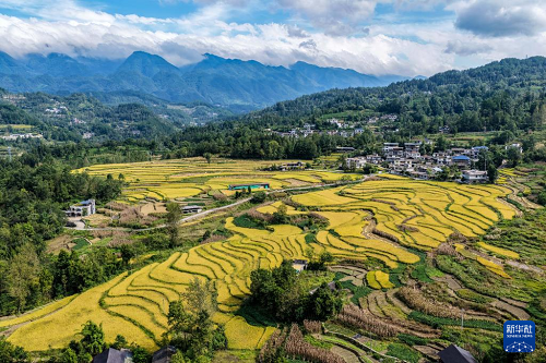 地處武陵山區(qū)腹地的重慶市黔江區(qū)五里鎮(zhèn)水稻種植面積5300畝,是武陵山地區(qū)糧食主要產(chǎn)區(qū)之一。秋收時(shí)節(jié),金黃色的水稻鋪滿山坡,稻農(nóng)們利用晴好天氣搶收稻谷,呈現(xiàn)出一派美麗的豐收畫(huà)卷。