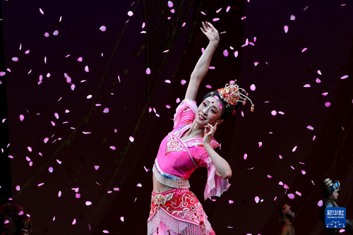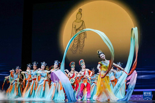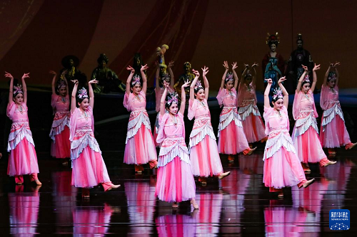 9月20日晚,演員在敦煌大劇院表演新版《絲路花雨》。(新華社記者 郎兵兵 攝)