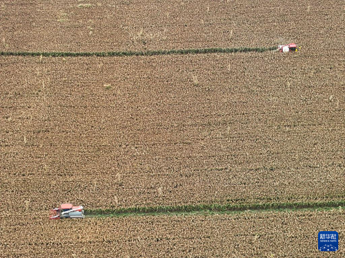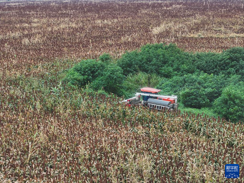 9月21日,收割機在地里收割高粱(無人機照片)。(新華社記者 季春鵬 攝)