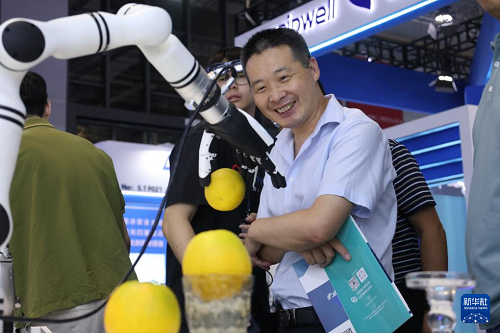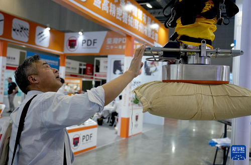 9月23日,參觀者在一個進(jìn)行抓取動作演示的機器手展品前駐足觀看。(新華社發(fā) 潘宗源 攝)