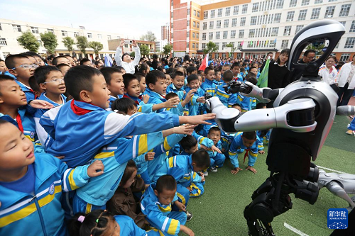 9月25日,在甘肅省定西市安定區(qū)西關(guān)小學(xué),學(xué)生和人形機(jī)器人互動(dòng)。(新華社發(fā) 王克賢 攝)
