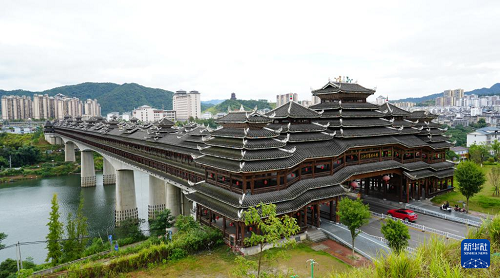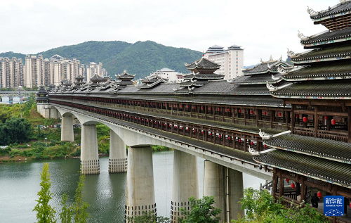 這是9月25日拍攝的三江侗族自治縣的宜陽風(fēng)雨橋。該橋橫跨潯江之上,全長399.6米,寬28米。橋面設(shè)雙向四車道,橋上共兩層,二層建有跨橋人行通道。(新華社記者 張楓 攝)