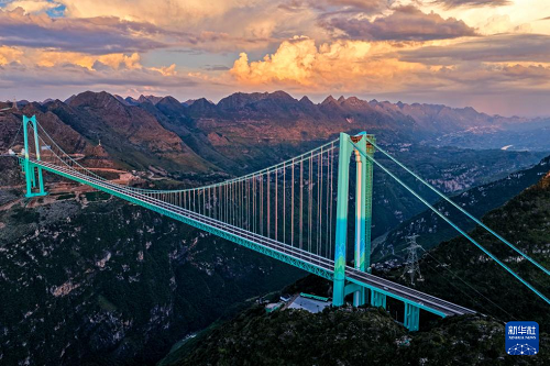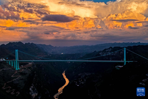 花江峽谷大橋是貴州六枝至安龍高速公路的控制性工程,大橋全長2890米,主跨1420米,是目前世界山區(qū)峽谷第一大跨度鋼桁梁懸索橋;其橋面距水面垂直高度625米,超越北盤江第一橋成為新的世界第一高橋,被譽(yù)為“橫豎都是第一”。在不同時段的光線下,世界第一高橋呈現(xiàn)出不同的美景。