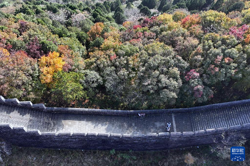 10月28日拍攝的天津市薊州區(qū)黃崖關(guān)長(zhǎng)城秋景(無人機(jī)照片)。(新華社記者 李然 攝)
