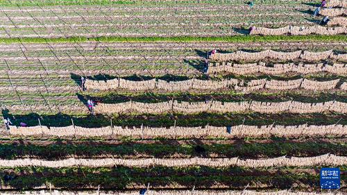 10月29日,農(nóng)民在寧夏吳忠市紅寺堡區(qū)紅寺堡鎮(zhèn)弘德村晾曬蘿卜條(無人機(jī)照片)。(新華社記者 楊植森 攝)