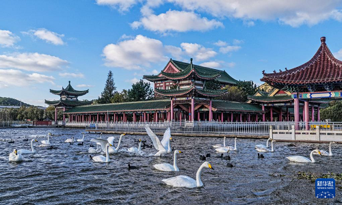 11月2日,在山東省榮成市成山鎮(zhèn)西霞口隆霞湖公園,大天鵝在棲息、覓食(無人機(jī)照片)。(新華社發(fā) 李信君 攝)