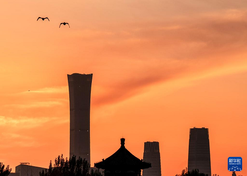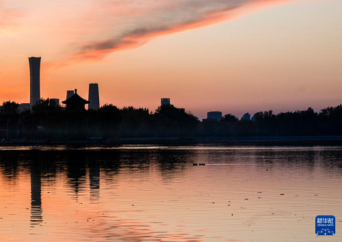 11月10日清晨,北京上空晨曦微露,霞光滿(mǎn)天。中國(guó)尊、望海樓等地標(biāo)建筑在晨光中與什剎海光影交錯(cuò)。