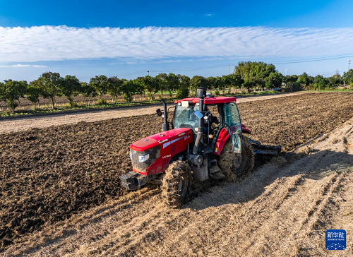 11月11日,農(nóng)民駕駛農(nóng)機在河南省焦作市溫縣黃河灘區(qū)播種小麥。(新華社發(fā) 黃福興 攝)