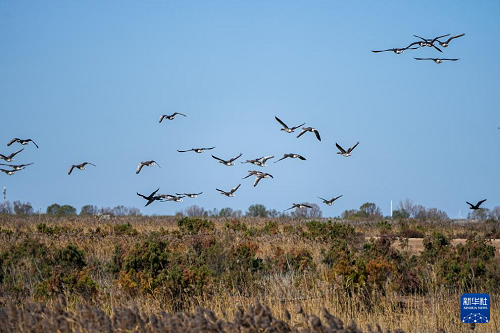 11月13日,山東黃河三角洲國(guó)家級(jí)自然保護(hù)區(qū)內(nèi),越冬候鳥(niǎo)在飛翔。(新華社記者 朱崢 攝)
