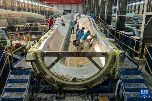 11月20日,在甘肅省酒泉經(jīng)濟技術(shù)開發(fā)區(qū)的甘肅九鼎風電復合材料有限公司成型車間,工作人員進行風機葉片鋪層作業(yè)(無人機照片)。(新華社記者 郎兵兵 攝)