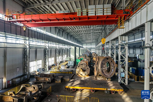11月20日,在甘肅省酒泉經(jīng)濟技術(shù)開發(fā)區(qū)的日月重工(甘肅)有限公司機加車間,工作人員操作起重機轉(zhuǎn)運風機輪轂(無人機照片)。(新華社記者 郎兵兵 攝)