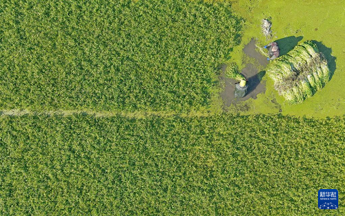 12月7日,江蘇省海安市墩頭鎮(zhèn)長垎村水芹菜種植基地,菜農(nóng)在水田里采收水芹菜(無人機照片)。(新華社發(fā) 周強 攝)