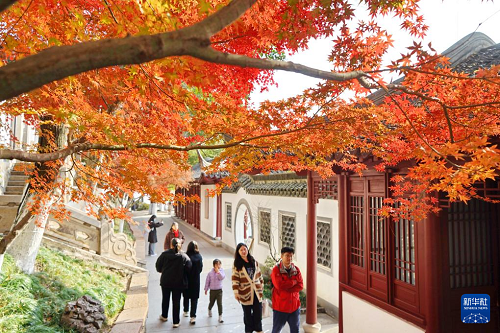 12月8日,游客在浙江省嘉興市南湖景區(qū)湖心島觀賞楓葉。(新華社發(fā) 金鵬 攝)