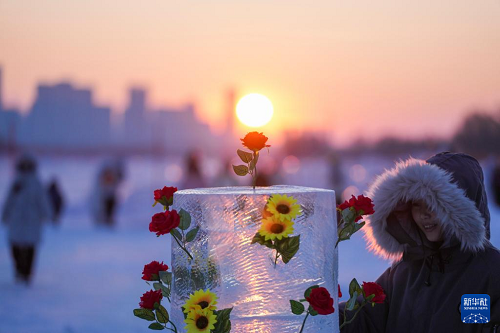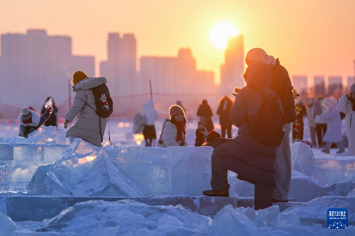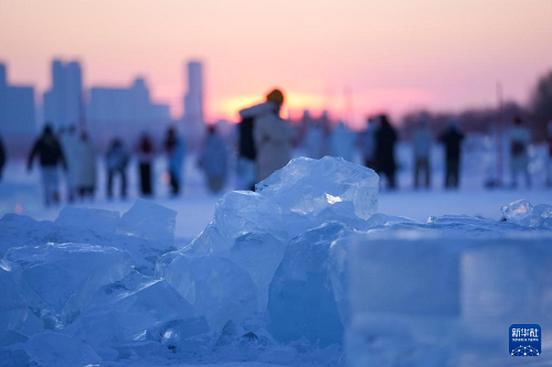 時下,“冰城”哈爾濱市正值冰雪旅游旺季。松花江哈爾濱段一處采冰場,由于大量堆積高純凈度的冰塊,而被游客稱為“鉆石海”,成為網紅景區(qū)。只要是晴好天氣,都會有許多游客來到“鉆石?!本皡^(qū),欣賞浪漫的落日美景。