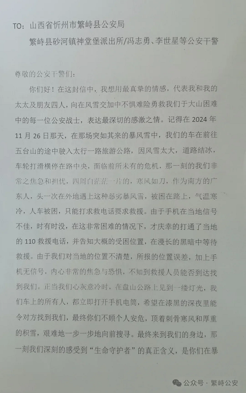 2025年1月1日,繁峙縣公安局收到了來自廣東省佛山市市民趙岸華等4人聯(lián)名寄來的感謝信,信中表達了對繁峙公安局神堂堡派出所民警頂風冒雪深夜馳援,及時救助其脫險的感激之情。