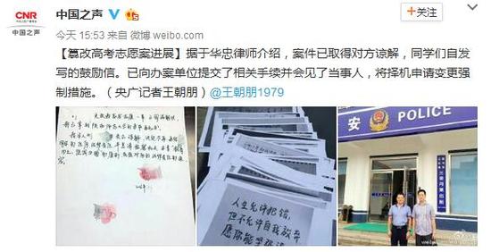 備受關(guān)注的山東青島膠州高三畢業(yè)生常升高考志愿被 同學(xué)郭某某篡改一事有最新進(jìn)展。案件已取得對(duì)方諒解,同學(xué)們自發(fā)寫鼓勵(lì)信。已向辦案單位提交了相關(guān)手續(xù)并會(huì)見(jiàn)了當(dāng)事人,將擇機(jī)申請(qǐng)變更強(qiáng)制措施。(來(lái)源:中國(guó)之聲)