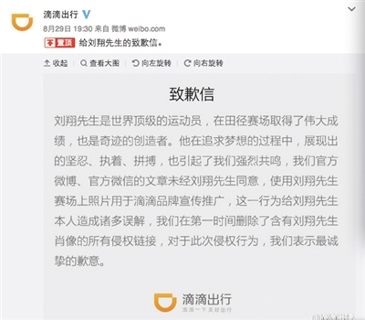 8月29日晚間,滴滴發(fā)出道歉信稱,“官方微博、官方微信的文章未經(jīng)劉翔同意,使用劉翔賽場上照片用于滴滴品牌宣傳推廣,這一行為給劉翔本人造成諸多誤解,在第一時間刪除了含有劉翔先生肖像的所有侵權鏈接,對于此次侵權行為,我們表示最誠摯的歉意?!?/p>