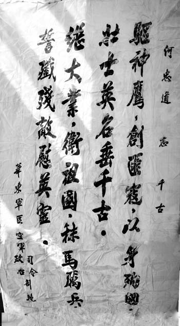 何忠道的犧牲,引起了整個空軍系統(tǒng)的震憾,人民空軍舉行了隆重的追悼大會。空軍機關(guān)、華東軍區(qū)、生前所在部隊機關(guān)、戰(zhàn)友送了幾十幀挽幛。空軍司令員劉亞樓、副司令員常乾坤、副政委吳法憲、參謀長王秉璋聯(lián)名敬獻的挽幛上書:“殲滅美國侵略者,堅決保衛(wèi)祖國領(lǐng)空,為何忠道同志復(fù)仇!”華東軍區(qū)司令部、政治部敬獻的挽幛上書:“驅(qū)神鷹,創(chuàng)飛寇,以身殉國,壯士英名垂千古。創(chuàng)大業(yè),衛(wèi)祖國,秣馬厲兵,誓殲殘敵慰英靈?!?/p>