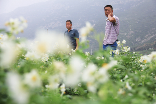 8月13日,原平市紅池村民正在土豆地里查看長勢,兩人看著喜人的土豆開心的笑了。原平市山區(qū)農(nóng)民根據(jù)土地土壤結(jié)構(gòu)松散的特點(diǎn),以種植土豆為主要農(nóng)作物,不分地塊大小,也不論坡地還是平地,長出的土豆個(gè)頭大好吃,既可以當(dāng)主食食用,也可以制作為蔬菜,一食多用,是餐桌上的香餑餑,銷售價(jià)格節(jié)節(jié)攀升,是山區(qū)百姓脫貧致富的金圪蛋。(吉建平 攝)
