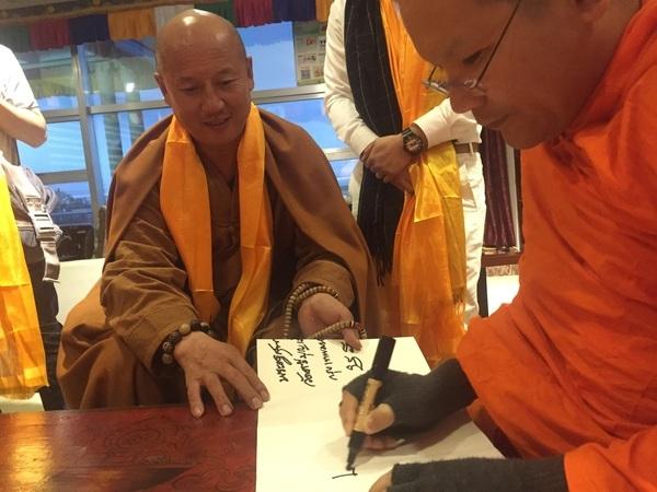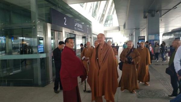 圖為五臺(tái)山望海寺住持釋覺一法師與弟子們順利到達(dá)西寧機(jī)場(chǎng),木蘭加措法師前往迎接。