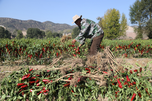 10月8日,靜樂縣永倉種植專業(yè)合作社萬畝辣椒種植示范園中10300畝辣椒喜獲豐收。近年來,該縣調(diào)整產(chǎn)業(yè)結(jié)構(gòu),大力發(fā)展無公害辣椒種植,引進(jìn)種植新品種韓國紅辣椒。該合作社今年連片訂單栽植的10300 畝辣椒目前長(zhǎng)勢(shì)良好,預(yù)計(jì)平均畝產(chǎn)6000 斤,最高可達(dá)一萬斤。今年又是一個(gè)豐產(chǎn)年,大伙的生活就像紅辣椒一樣過得紅紅火火。圖為合作社工人在收獲辣椒。(閆曉梅 攝)
