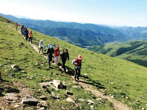 白琦瑞 我們不曾相識,一點(diǎn)愛溫暖了人間。從東臺下來,一開始就不見了女兒,還好有閨蜜在身邊談天說地,偶爾“龍哥”擦身而過扔下一句笑話,轉(zhuǎn)眼就不見了蹤影;劉教授常跑國外,腿很長,頭戴禮帽,不用登山杖,腳步輕盈;“大師兄”人見人愛,他的腰間掛一個袋子,是用來裝路上撿到的水瓶、塑料袋、果皮等垃圾的,他身上的雨衣、登山杖好像是給大伙準(zhǔn)備的,誰需要就送給誰;郭大律師看見剛從山下上來,上氣不接下氣、氣喘不停的同行人,忙把自己的雨衣翻過來鋪在大石頭上讓人坐?!吧裢取笨偸窃陉?duì)伍的最后,落在后面的人,只要看見“神腿”就信心倍增,和“神腿”合張影,比出個“二”的手勢,仿佛自己也是“神腿”了。吳老師人很好,熱情地幫我拍了一張“打坐”的美照,真可謂不懂?dāng)z影的老師不是優(yōu)秀企業(yè)家;見到海濤群主不時從山上往山下跑,照顧落在后面的人;又遇見一位腰間掛垃圾袋的人,他走近一頭正在喂奶的母牛,像老朋友一樣輕輕地?fù)崦@牛的頭部,聽說他是講國學(xué)的馬老師。佛家講的是一種緣分,有緣自然來相會,我和馬老師聊著爬上了一個山頭,心頭一怔,馬老師不就是我們的學(xué)問大咖嗎?我們的八月大朝臺隊(duì)伍里藏龍臥虎,稍不留神,大咖就會從你身邊溜走。正說著,閨蜜劉老師從我身邊經(jīng)過,腰間掛著一袋子垃圾,直向前面一個易拉罐追去……