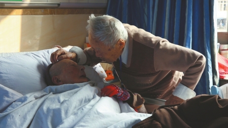 老兩口70年前結(jié)婚時(shí)的老照片。 廖思源從家里的木質(zhì)老式柜子里,拿出一本相冊(cè)。他用布滿皺紋的手翻開,拿出一張黑白婚紗照,看了又看:廖思源身著白襯衣和西裝,打著領(lǐng)帶,看起來格外精神。鐘貞淑頭戴婚紗,一席花色的長(zhǎng)裙,右手捧著鮮花。兩人手挽著手,表情有點(diǎn)嚴(yán)肅,濃濃的年代感將時(shí)間拉回到了1949年。 廖思源和鐘貞淑是同學(xué),上世紀(jì)40年代,兩人都20出頭,廖思源用當(dāng)時(shí)少見的“手法”追求鐘貞淑。他讀的是金融財(cái)會(huì)專業(yè),會(huì)英文,經(jīng)常用英文給鐘貞淑寫信。那些說不出口的肉麻情話,被廖思源用鐘貞淑看不懂的語言寫了進(jìn)去,最終靠書信贏得了鐘貞淑的芳心。兩人戀愛后結(jié)婚,之后育下三子一女。 婚后的生活很平淡,但在兒子廖思明眼里,父母一直很恩愛。兩人退休后出門散步逛街,走哪兒都是牽著手,“我爸是火巴耳朵,我媽性子比較急躁一些,有時(shí)候罵我爸說他不對(duì),他就聽到,說我媽說啥子都是對(duì)的?!眱扇讼矚g到處旅游,全國(guó)各地到處走,幾乎拍的每一張照片都是緊緊依偎在一起,誰看到都感到甜蜜和親昵。 B 命運(yùn) 妻子患病失憶 患癌丈夫悉心照料 十多年前,廖思源被查出患前列腺癌,一聽到癌癥,鐘貞淑嚇壞了,躲在房間里一直哭。好在病情不算嚴(yán)重,廖思源每個(gè)月靠打針吃藥就能緩解病痛,但鐘貞淑在一次意外后,卻再也不能回到健康的狀態(tài)了。 2015年,鐘婆婆在家意外跌倒,診斷為腦部血腫和肺部感染,一直處于昏迷狀態(tài),醫(yī)院也下了病危通知書。近三個(gè)月后,鐘貞淑奇跡般地醒了過來,并在家人的照料下慢慢好轉(zhuǎn)。沒想到,她在此時(shí)卻又患上了另一種病:阿茲海默癥,俗稱老年癡呆。 這樣的病情,讓家人都難以接受。從最開始地記不住往事,到記不住親人的名字,到最后幾乎完全失憶,廖思源經(jīng)歷了整個(gè)過程。 “她得了老年癡呆,她已經(jīng)94歲了,不記得我了。”廖思源一字一句向記者講述著,鐘貞淑已經(jīng)不記得自己是誰了。三年來,鐘貞淑每天都躺在病床上,兒女都將近70歲,精力有限,無法細(xì)致照料。除了每天有護(hù)工照顧外,廖思源從不缺席。 每天早晨,廖思源6點(diǎn)過就起床,和家里的保姆一起去菜市買菜。選好菜后,廖思源叮囑保姆將幾種有營(yíng)養(yǎng)的食材做成飯,然后他親自去醫(yī)院守著鐘婆婆吃?!懊刻於家纱?,上午下午各一次。都說他年齡大了不要跑,他不答應(yīng),刮風(fēng)下雨都要去?!?/p> C 表白 每天醫(yī)院說情話“你就是我的寶貝” 廖思源家離醫(yī)院只有幾百米的距離,但96歲的他要走過去卻并不容易,他出門后會(huì)坐一輛三輪車,到醫(yī)院門口后自己坐電梯上樓,拄著拐杖走過整個(gè)走廊。 “我要來給她按摩,她躺久了,肌肉要萎縮。”廖思源心疼地說,妻子有時(shí)候甚至錯(cuò)認(rèn)他是她的父親,這讓他感到無奈,但這并不妨礙他每天悉心的照顧。 “鐘婆婆,我來看你了。”鐘貞淑看到有人來看她,張開嘴似乎想說什么,但只發(fā)出模糊的聲音。 也許是認(rèn)不出廖思源,鐘婆婆有些排斥,廖思源開始從她的腿部做按摩,幫助她活動(dòng),然后慢慢捏手,再撓頭部。他一邊捏著一邊安慰她,“來嘛,按了好。” 每天在醫(yī)院,廖思源也會(huì)幫助鐘貞淑回憶往事,“你好多歲了曉得不,你94歲了!”雖然鐘婆婆并不能完全聽懂廖思源的話,但會(huì)在廖思源靠近她的時(shí)候,露出些許笑容。 “廖大爺‘肉麻’得很哦,他天天要給鐘婆婆說,你是我的小寶貝,你要快點(diǎn)好起來,我愛你?!贝蠹叶颊f,很少見老年人這么說“肉麻”的話,可在鐘婆婆住院的這段時(shí)間里,廖思源每天都要說給她聽。 廖思明說,母親年輕的時(shí)候喜歡唱歌,父親也陪著她唱,這個(gè)習(xí)慣他們現(xiàn)在還保留著。廖思源唱了一首四川民歌《太陽出來喜洋洋》?!皝砺铮黄鸪?!”廖思源聲音有點(diǎn)慢,一臉深情地望著鐘貞淑,希望她能跟得上?!疤柍鰜韱盐梗惭笱髥币苍S是歌聲喚起了鐘貞淑的部分回憶,一聽到這首歌,她也張開了嘴唱和著,盡管吐詞不大清楚,卻一直聽著廖思源唱,看著他等自己跟著唱。見到鐘婆婆有了反應(yīng),廖思源也露出了微笑。 D 堅(jiān)持最長(zhǎng)情的告白“希望陪她活到100歲” 廖思明說,母親病重的這幾年來,家人都以為她挺不過來了,但她都堅(jiān)持了下來?!斑B醫(yī)生都說這是愛情的力量,陪伴才是最好的告白?!绷嗡荚春顽娯懯缃衲陝偤媒Y(jié)婚70年,無微不至的關(guān)愛在外人看來是偉大的愛情,但在廖思源看來卻是理所當(dāng)然的事。每當(dāng)有人問他為什么要這樣照顧鐘婆婆時(shí),他也不多說,只說一句:“因?yàn)槲覀兪欠蚱??!痹谒磥?,結(jié)婚就是一輩子的契約,“巴不得鐘婆婆活到100歲,以后的日子還會(huì)一直陪到她?!?/p> 3月的這天,進(jìn)入春天的成都出了太陽,陽光順著6樓的窗戶爬進(jìn)病房,照在這位老太太的臉上。窗臺(tái)上的青蔥又發(fā)了芽,廖思源兩鬢的白發(fā)逆著光顯得更白了,他用滿是皺紋的雙手拂過鐘貞淑的臉龐。 “你好多歲了?鐘婆婆?”護(hù)工問道。 “我20歲了!”鐘婆婆的回答讓護(hù)工有些哭笑不得,也許她還記得,20歲是她最好的年紀(jì),那一年她嫁給了他。時(shí)光涌動(dòng),穿過她的記憶,或許她的年華定