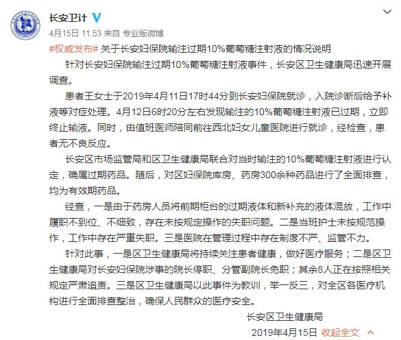 患者王女士于2019年4月11日17時(shí)44分到長(zhǎng)安婦保院就診,入院診斷后給予補(bǔ)液等對(duì)癥處理。4月12日6時(shí)20分左右發(fā)現(xiàn)輸注的10%葡萄糖注射液已過(guò)期,立即終止輸液。同時(shí),由值班醫(yī)師陪同前往西北婦女兒童醫(yī)院進(jìn)行就診,經(jīng)檢查,患者無(wú)不良反應(yīng)。