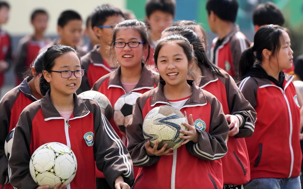 ↑這是學生們準備做足球操(4月18日攝)。新華社記者李俊東攝