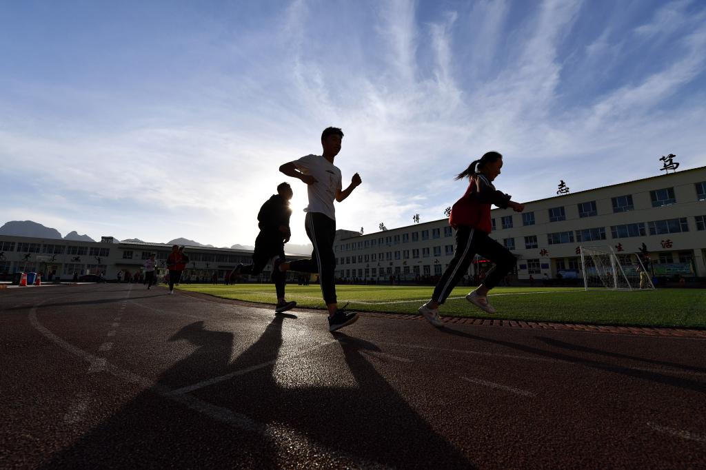 ↑這是學(xué)生們在跑步進(jìn)行體能訓(xùn)練(4月16日攝)。新華社記者詹彥攝