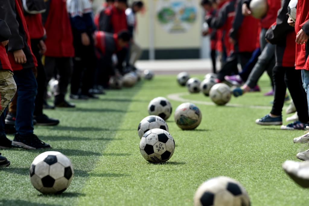↑這是學(xué)生們在練習(xí)傳球(4月18日攝)。新華社記者詹彥攝